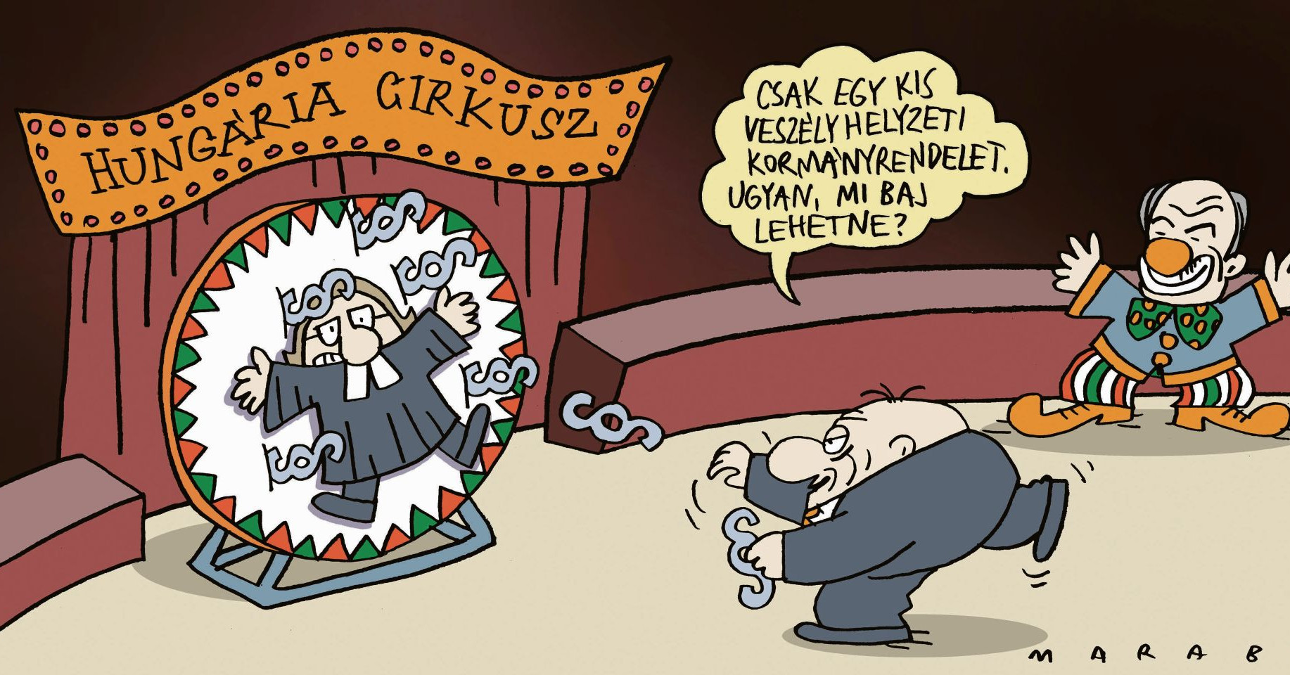 A fenti rajz, amely Marabu keze által született, először a Magyar Hang 2026/07. számában jelent meg február 13-án. A karikatúra szatirikusan kommentálja a kormányzati diskurzus abszurditását, amely a társadalomban feszültségeket generál.