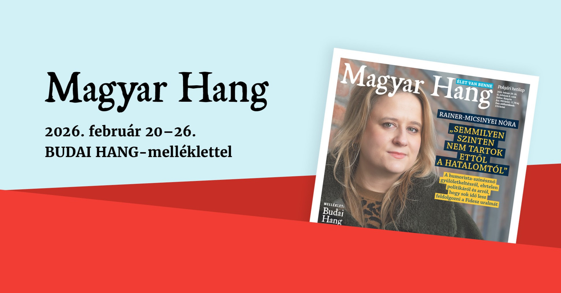 2026. február 20-tól kapható a Magyar Hang hetilap 2026/08. száma, amely különleges Budai Hang-mellékletet tartalmaz. Független közéleti lapunk példányait keresse az üzletekben, vagy válassza a digitális verziót, amely még kényelmesebb alternatíva. A Magyar Hang – Élet van benne!