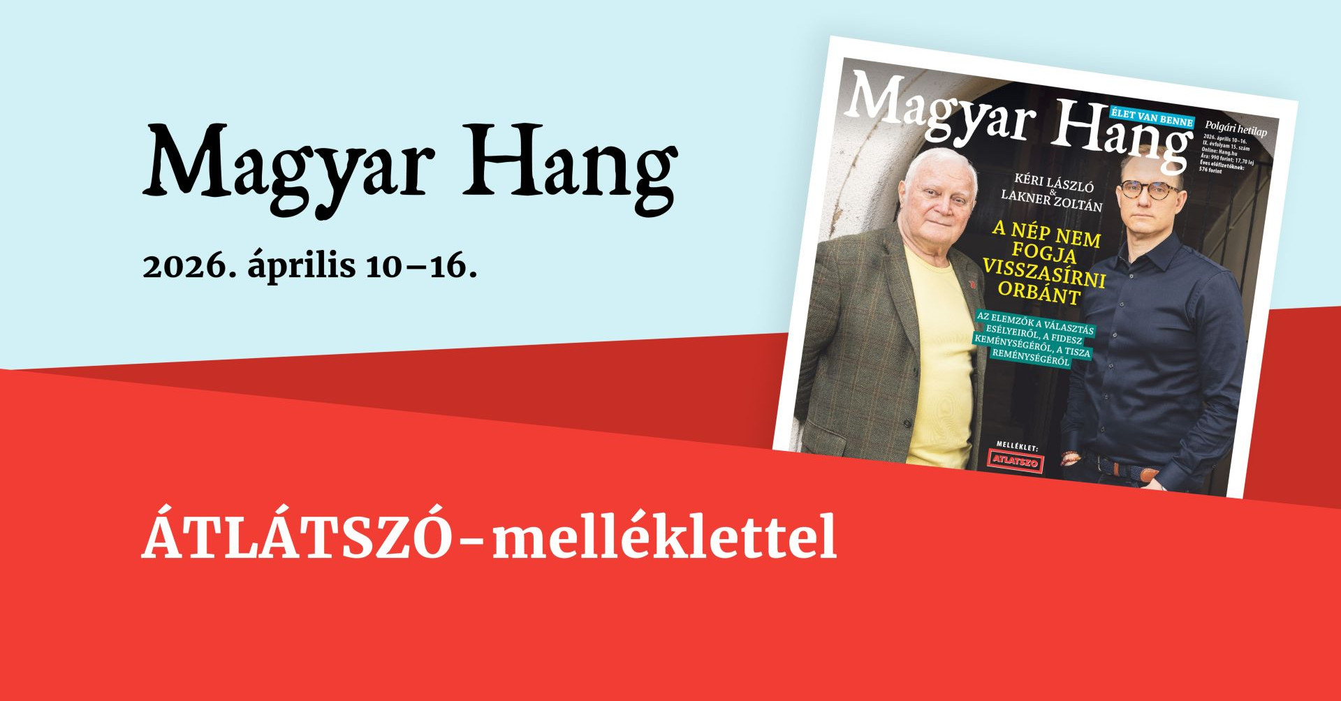 Április 10-től, péntektől kapható a Magyar Hang hetilap 2026/15. száma, amely ezúttal egy különleges Átlátszó-melléklettel készül! A független közéleti hetilap kereshető az üzletekben, de a legkényelmesebb megoldás a digitális előfizetés, amely lehetővé teszi, hogy a szám közvetlenül a postaládájába érkezzen.
